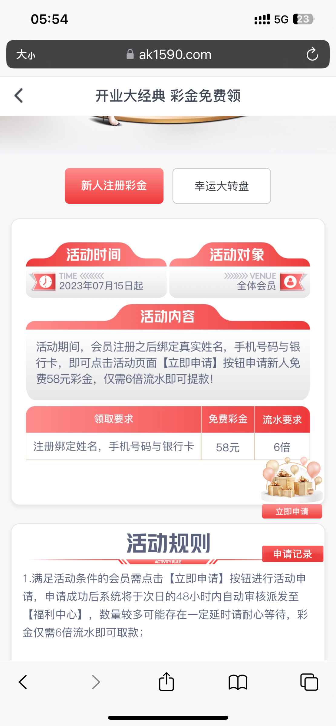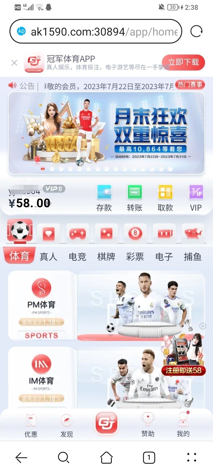 注册绑定姓名手机号码与银行卡 优惠里找到开业大庆典 申请58元 6倍流水 申请后48小时内送到福利中心领取 没有无视  跟完美体育差不多