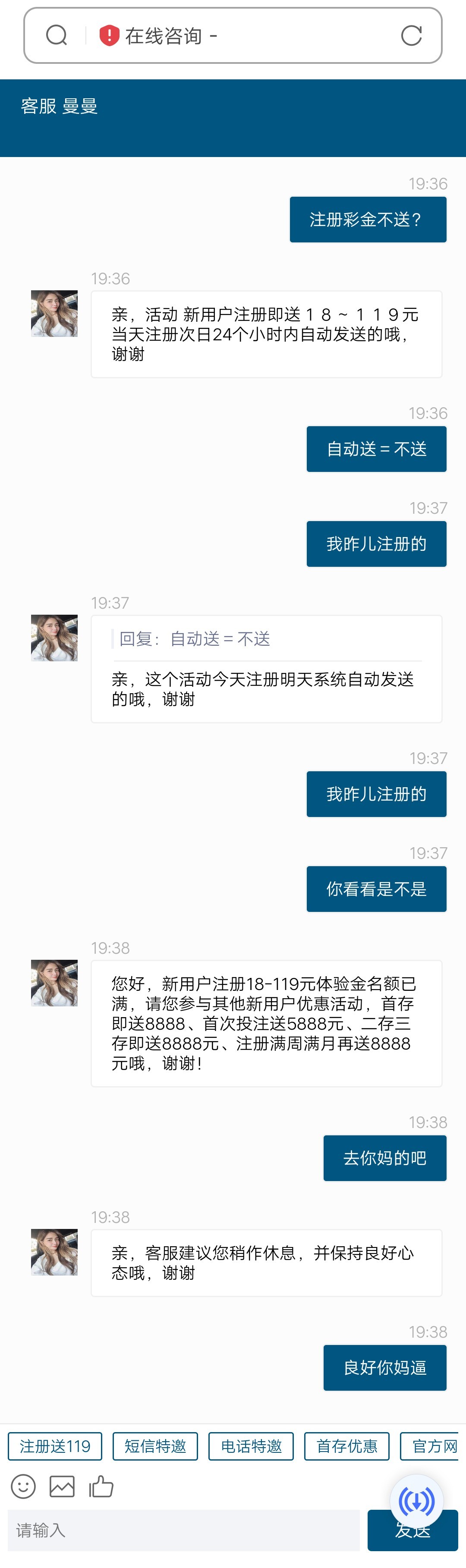 兄弟们找美女客服说好话  秒通过  说好听的话  不要一张口就骂他  肯定是没有的    管理速度审核我这条类容让更多人耗到  我刚刚已经成功领到了  秒审核