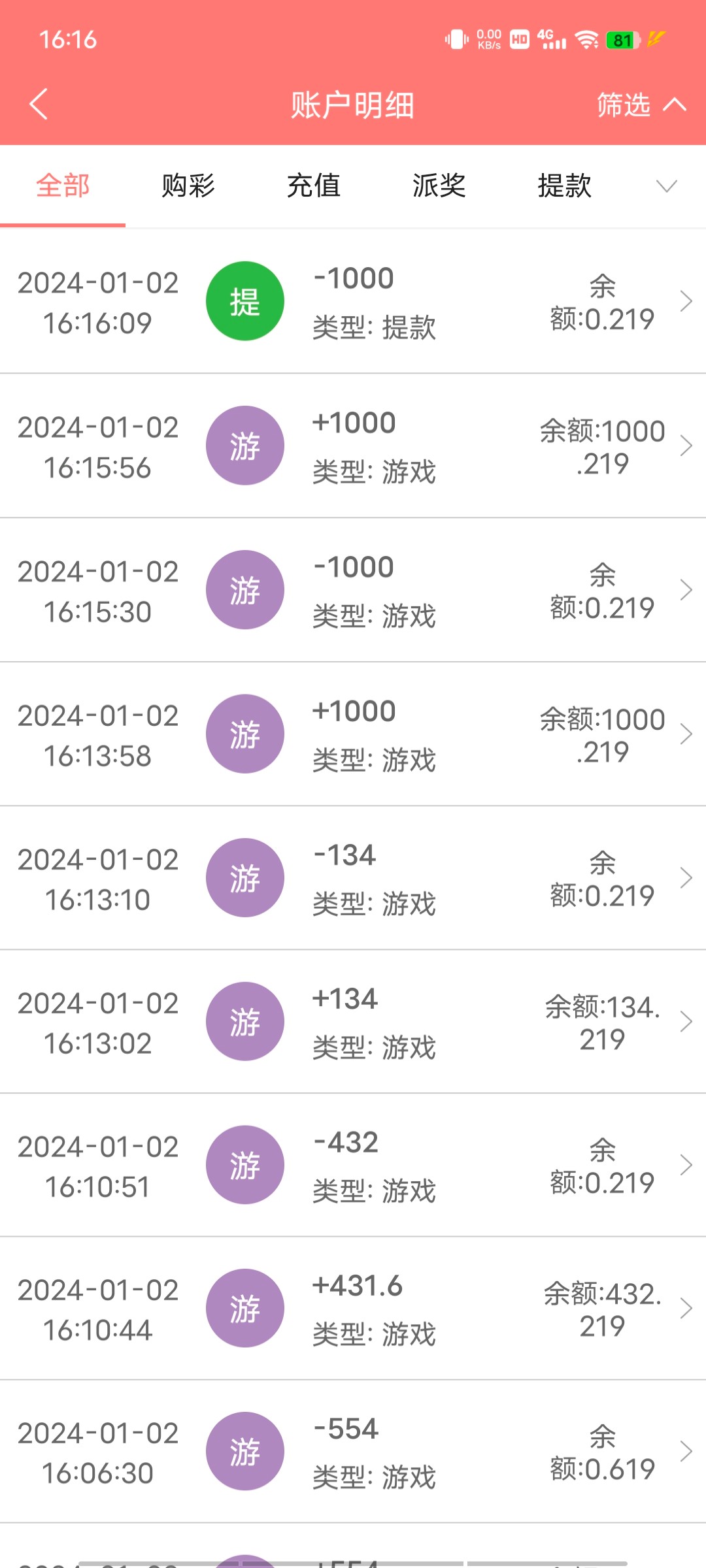 接着昨天5元红包上1000 然后提了1000钱能卖了300 剩下700给盛大了,真他妈的杀,一把不赢,本金都打不上去,直接没了