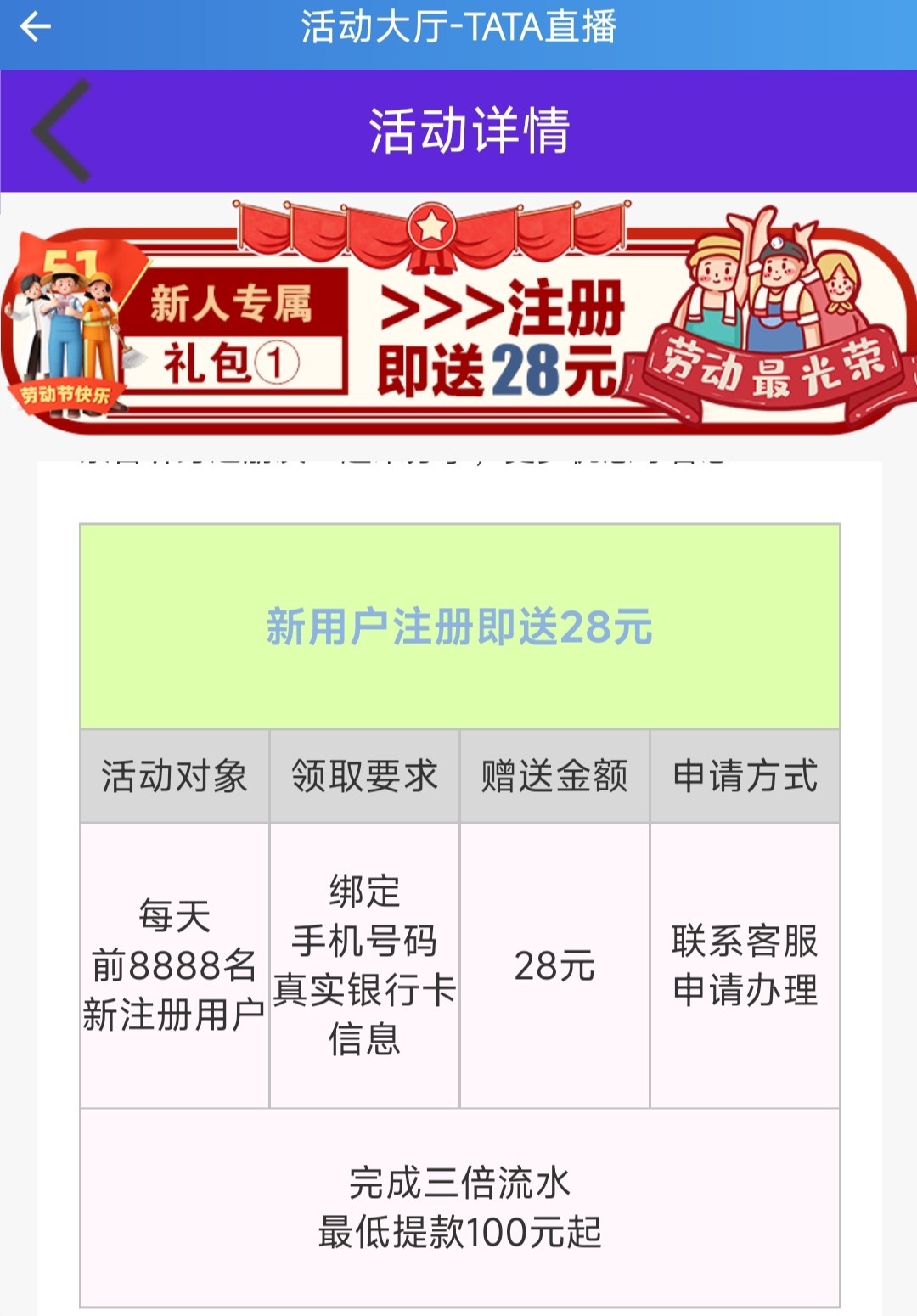新用户注册绑卡联系客服申请28彩金,三倍流水100即可出款。每天8888名额基本都有,满了就12点以后再试。