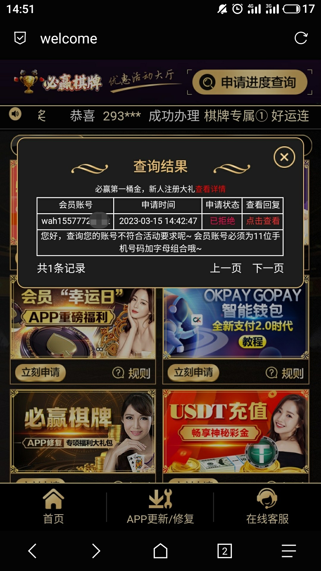 我14号注册的 碰到了 说最低288提款 我提了150到账了