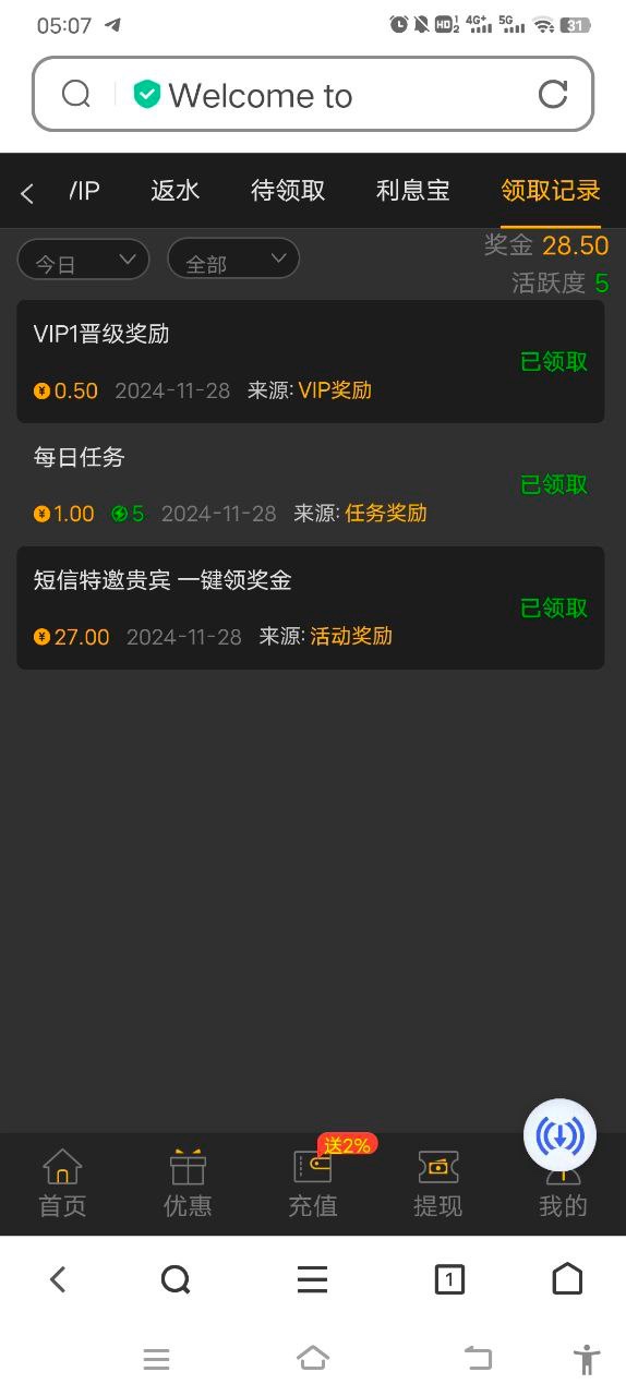 用账号注册的没有绑定银行卡和手机号码。输入验证码直接给了,一杯流水就能提现
