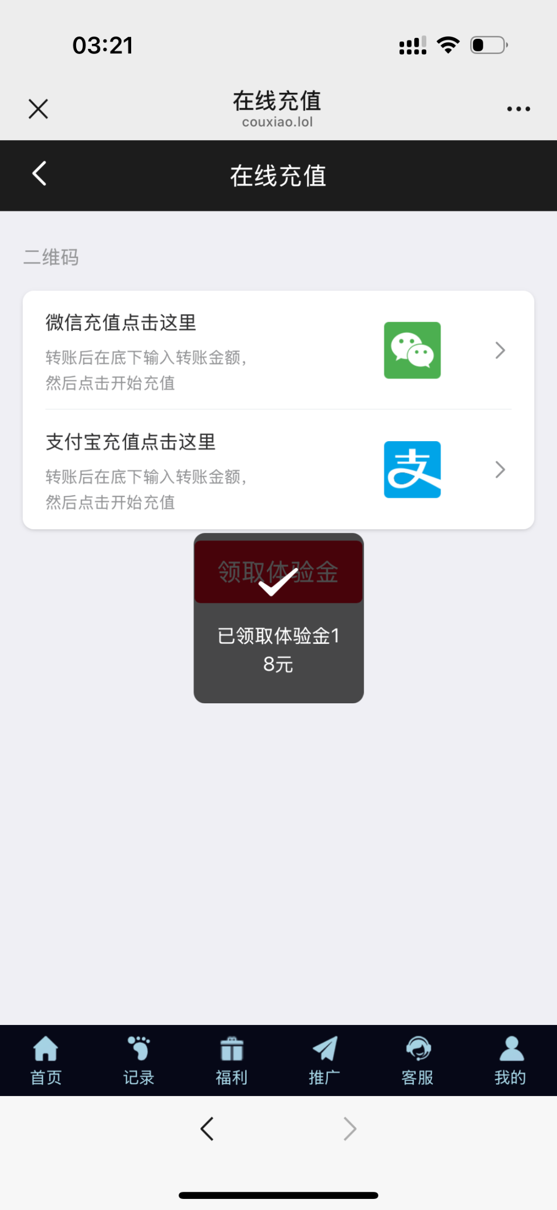 微信扫码登录,点击充值领取体验金秒送18!qq跟微信登录好像都送