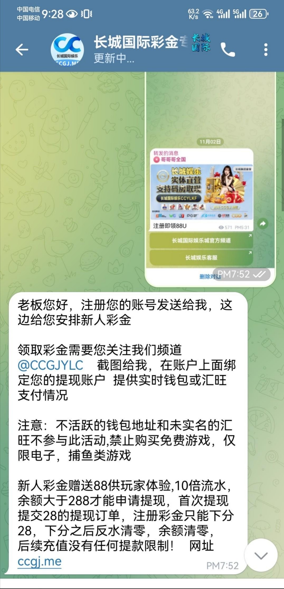 送88U飞机@ccylkf 绑定钱包找客服申请 彩金88打10倍流水余额满288下款28U 仅限投注电子捕鱼。